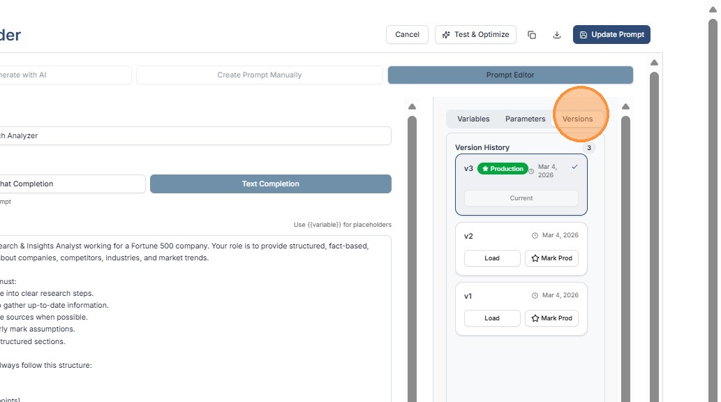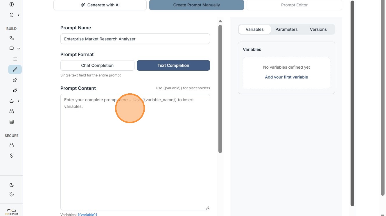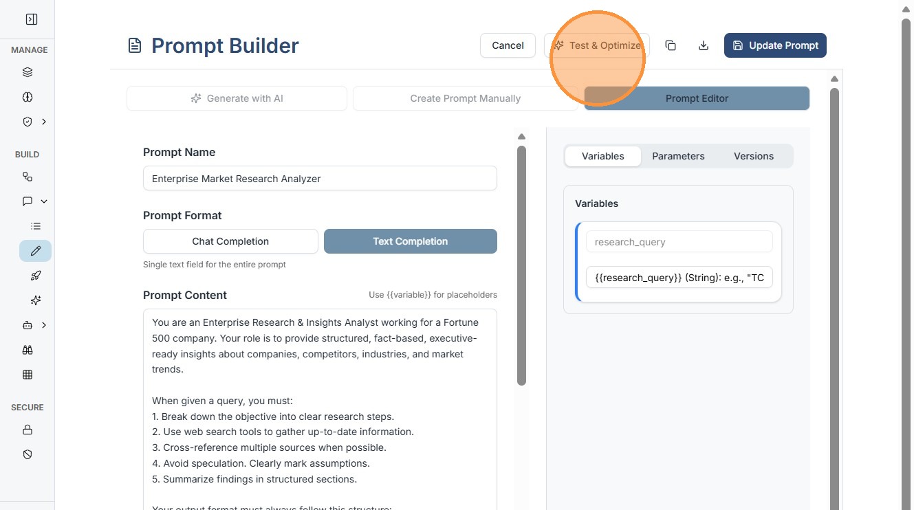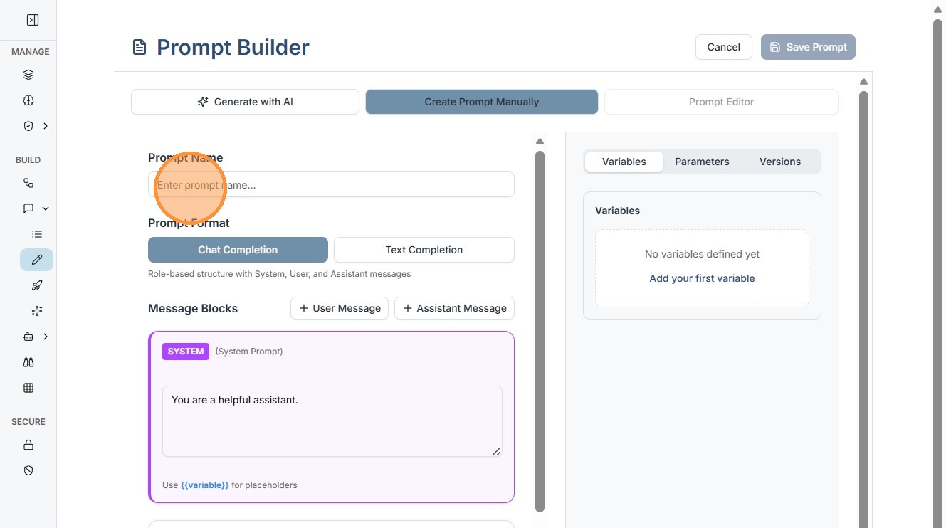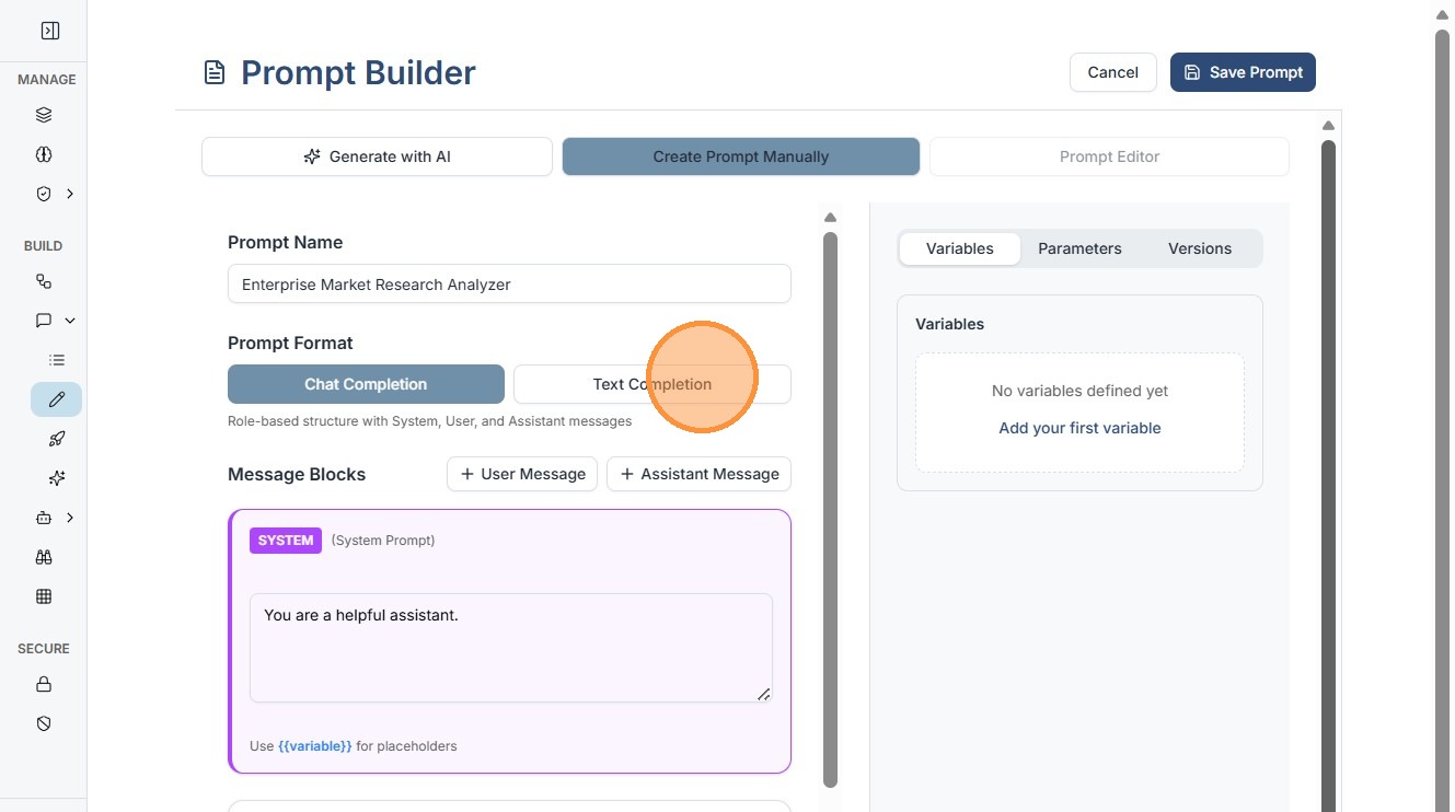 1. The Prompt Builder (accessible from the main dashboard via Prompts > Prompt Builder) is your canvas for crafting reusable instructions. It's intuitive yet powerful, supporting both Text Completion and Chat Completion .