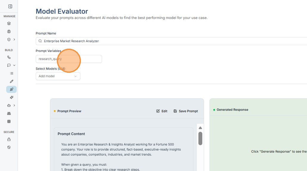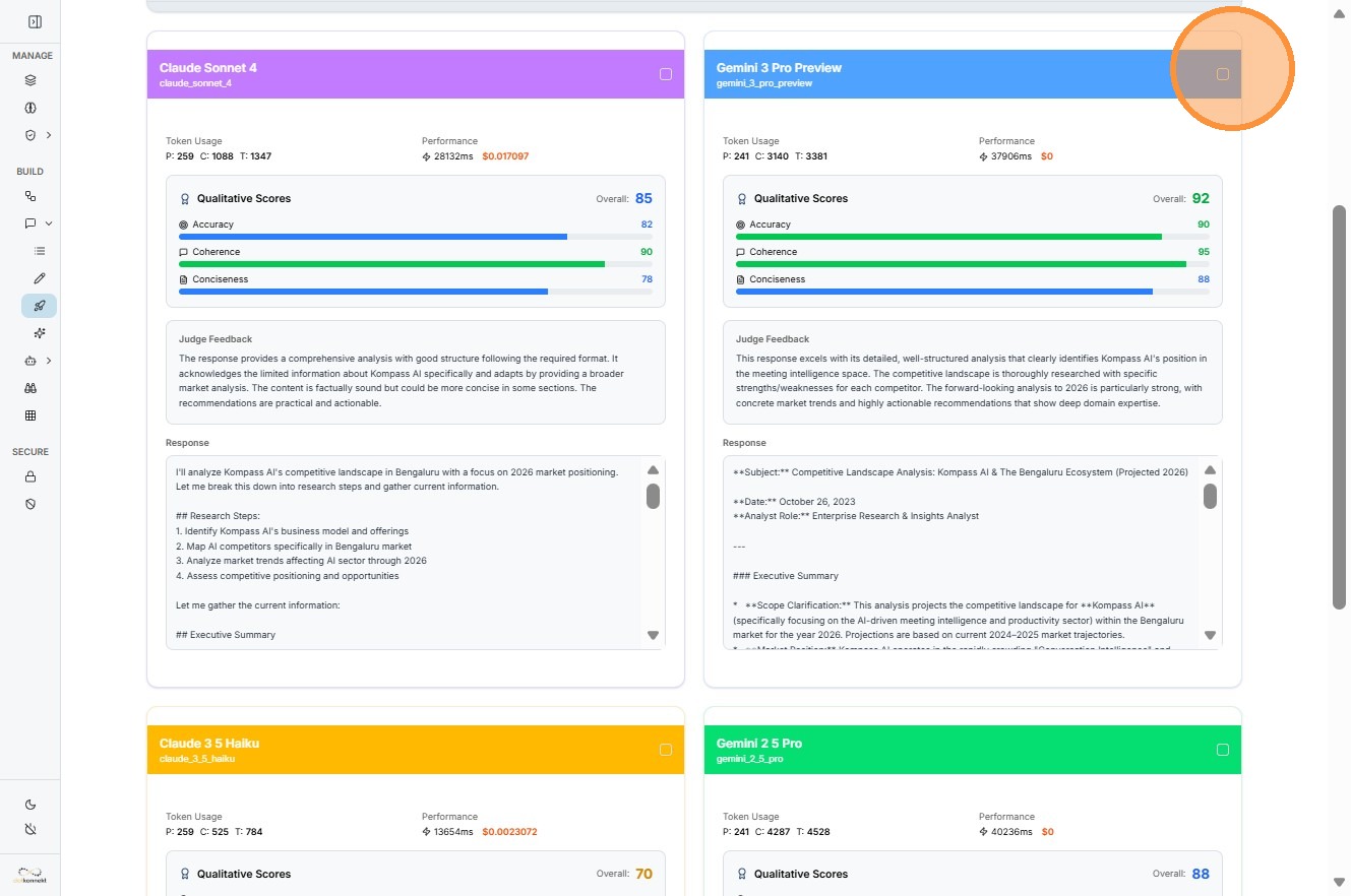 12. Use our built-in Model evaluator to score for clarity, conciseness, and adherence. Choose the most optimized model for your prompt based on the score.