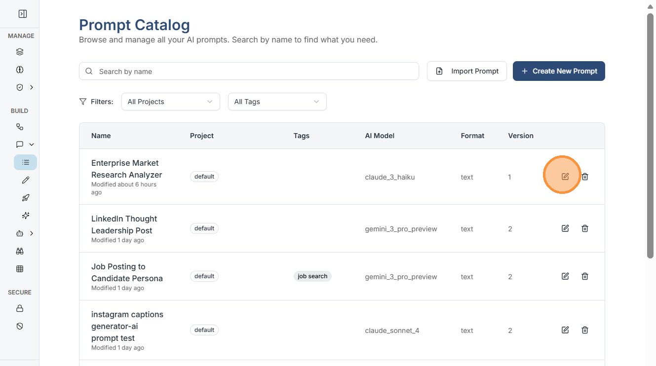 10. Your saved prompt will be visible in "Prompt Catalogue". Click the "edit" icon.