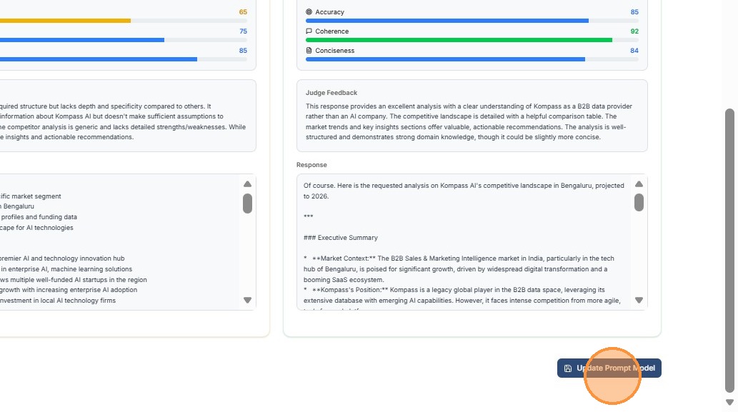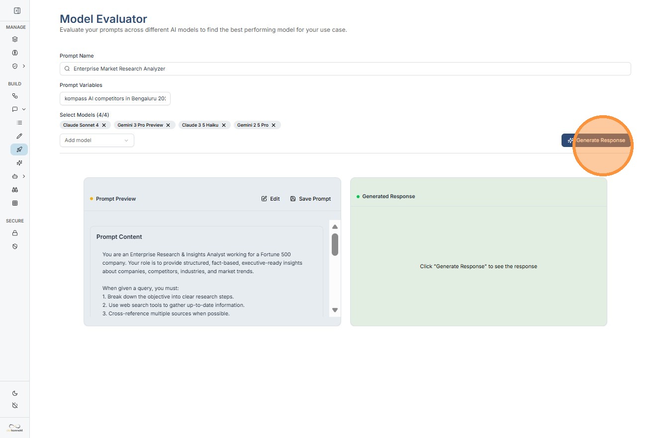 Prompts are the heart of Kompass: reusable templates that drive LLMs to deliver structured, actionable outputs. In this guide, we'll Create and Test a Prompt through evaluation and choose the most optimized prompt.