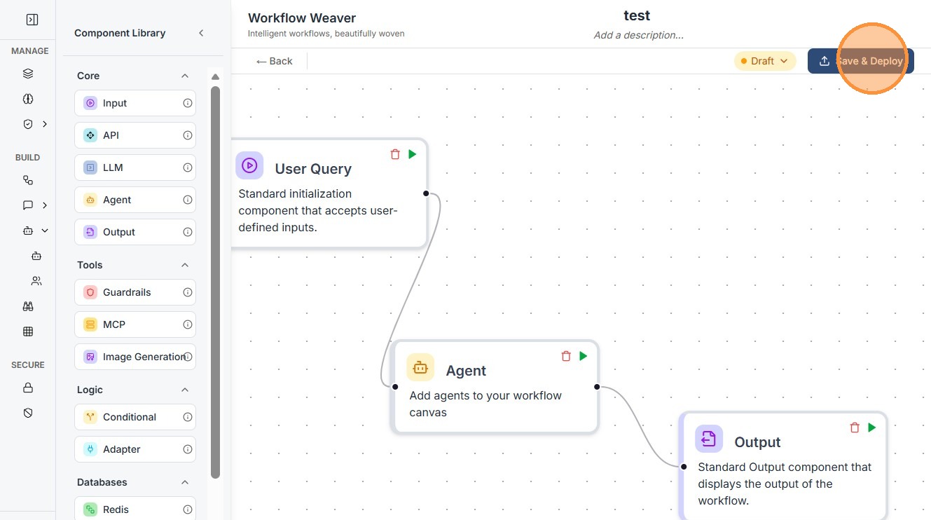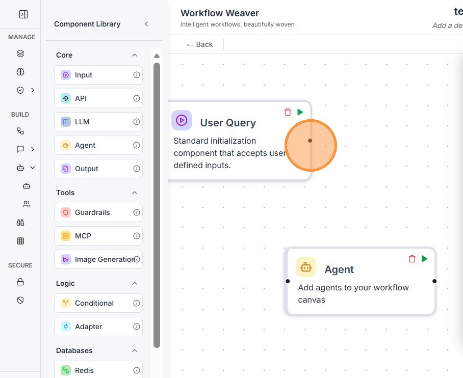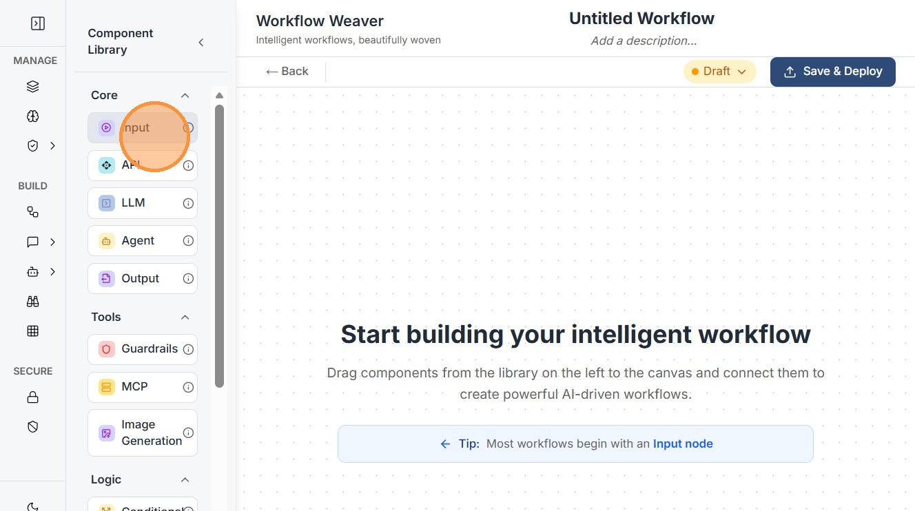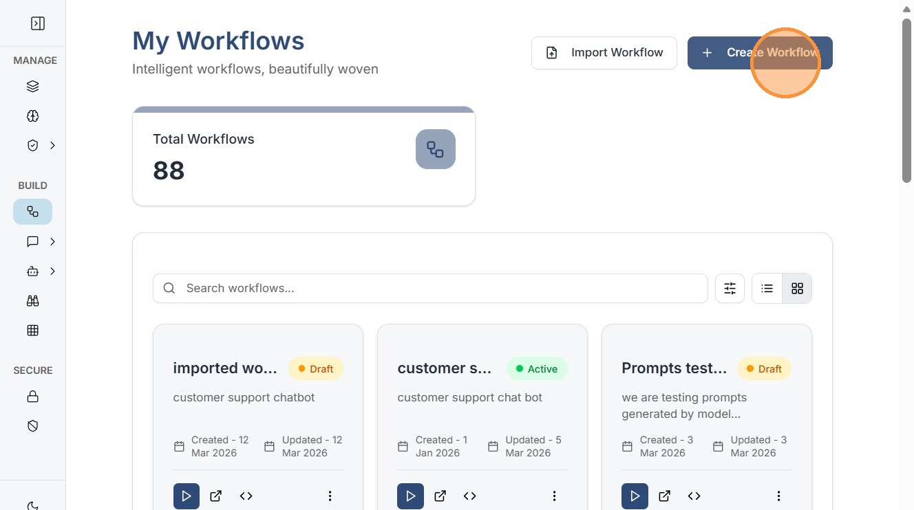 To begin, navigate to the Workflows icon on the sidebar and click "Create Workflow". This opens the Workflow Weaver—a visual canvas where logic is built using nodes.