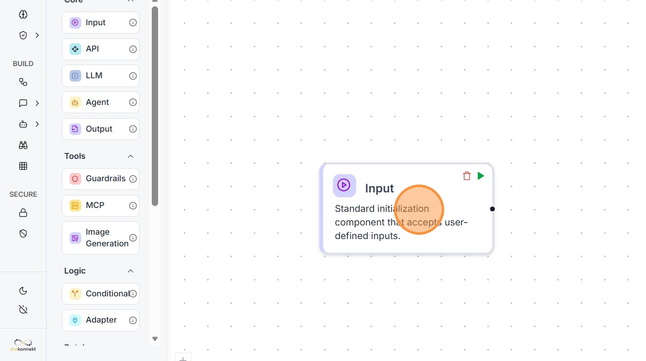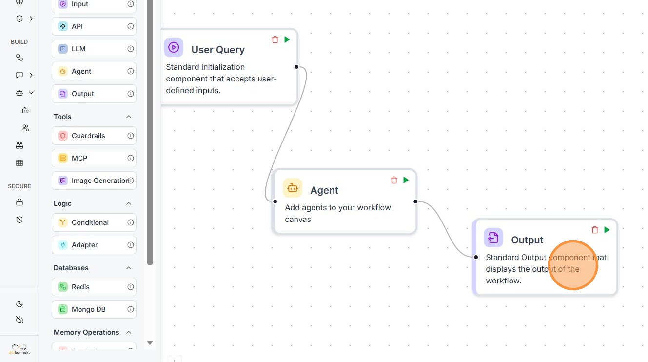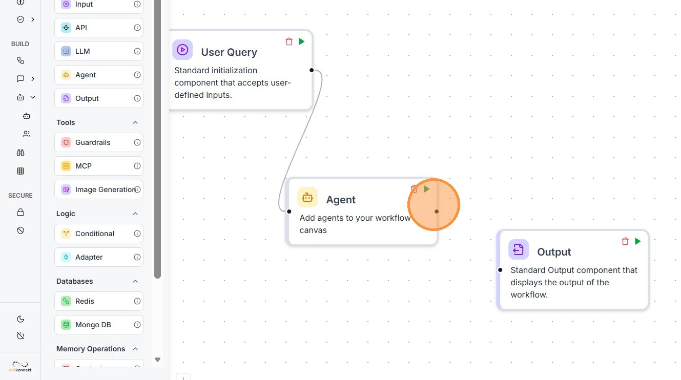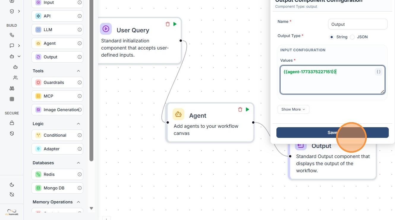 Mapping: Link the Output node to the Agent's result. This ensures that the final text or data generated by the LLM is what the user ultimately sees.