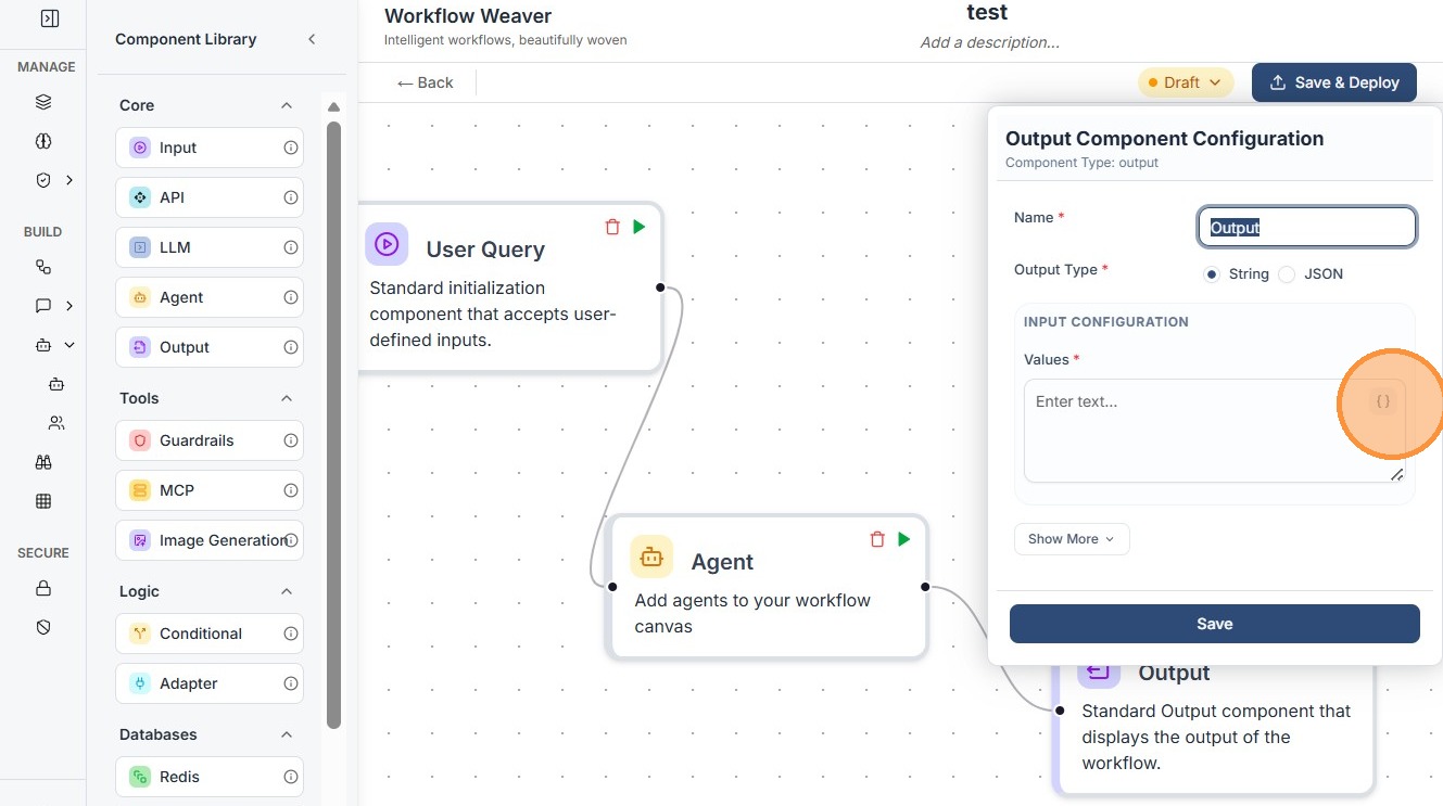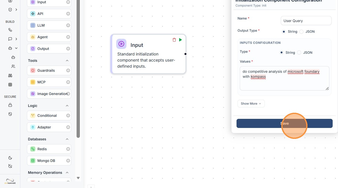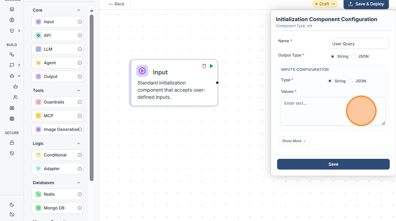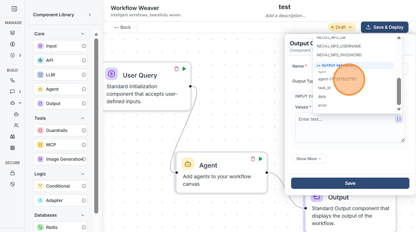 Mapping: Link the Output node to the Agent's result. This ensures that the final text or data generated by the LLM is what the user ultimately sees.
