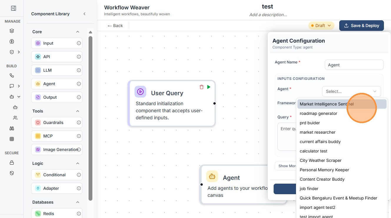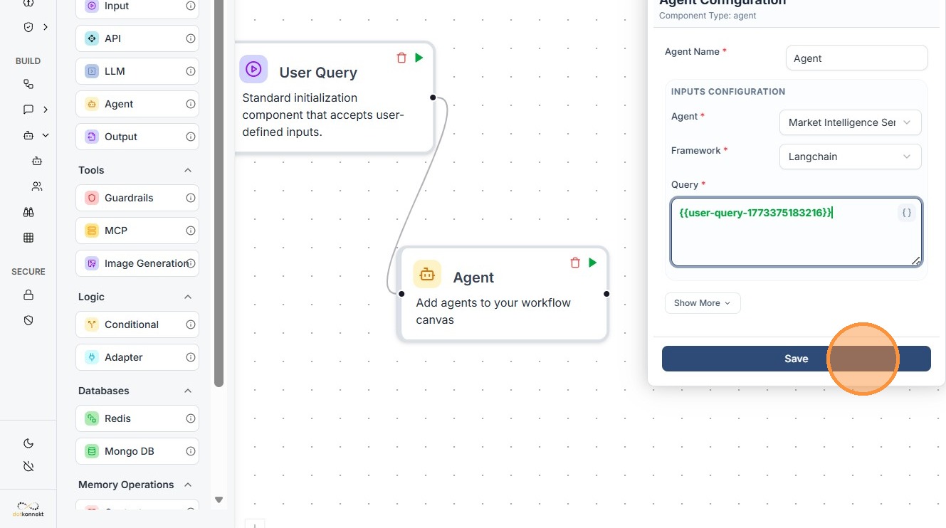 Technical Detail: In the configuration panel, you must select a pre-configured agent (e.g., "Market Intelligence Sentinel"). This links the node to the specific LLM settings, tools, and system prompts you defined in the Smart Agent builder.