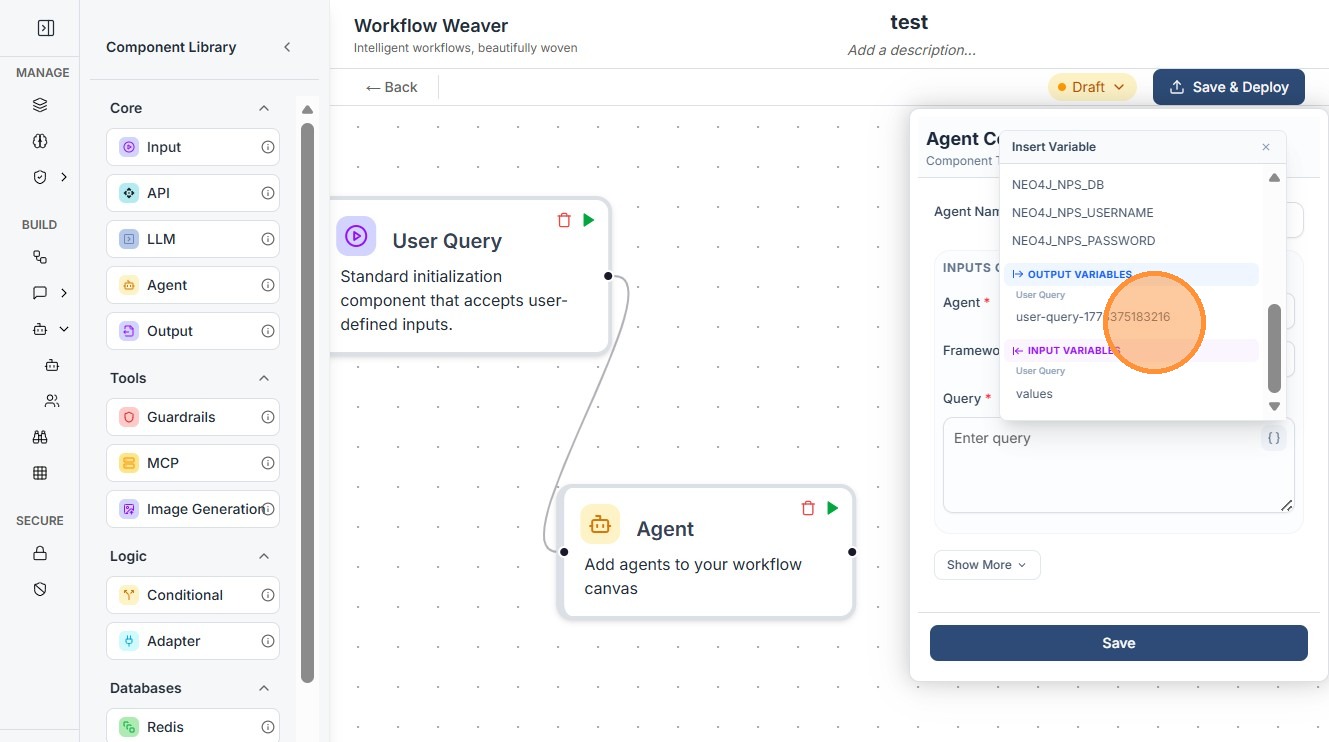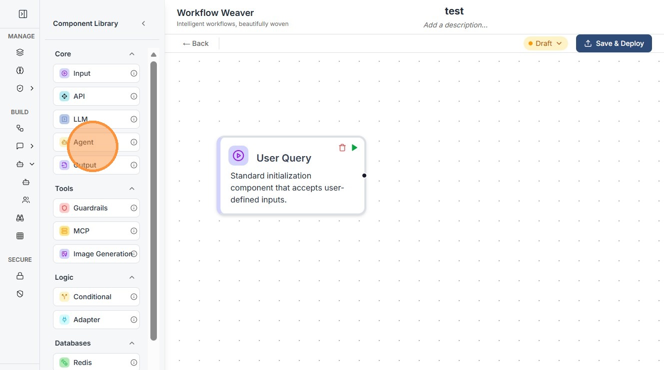 Technical Detail: Choose the "User Query" component. This acts as a standard initialization node that accepts user-defined inputs (strings, JSON, etc.) from the frontend or API.