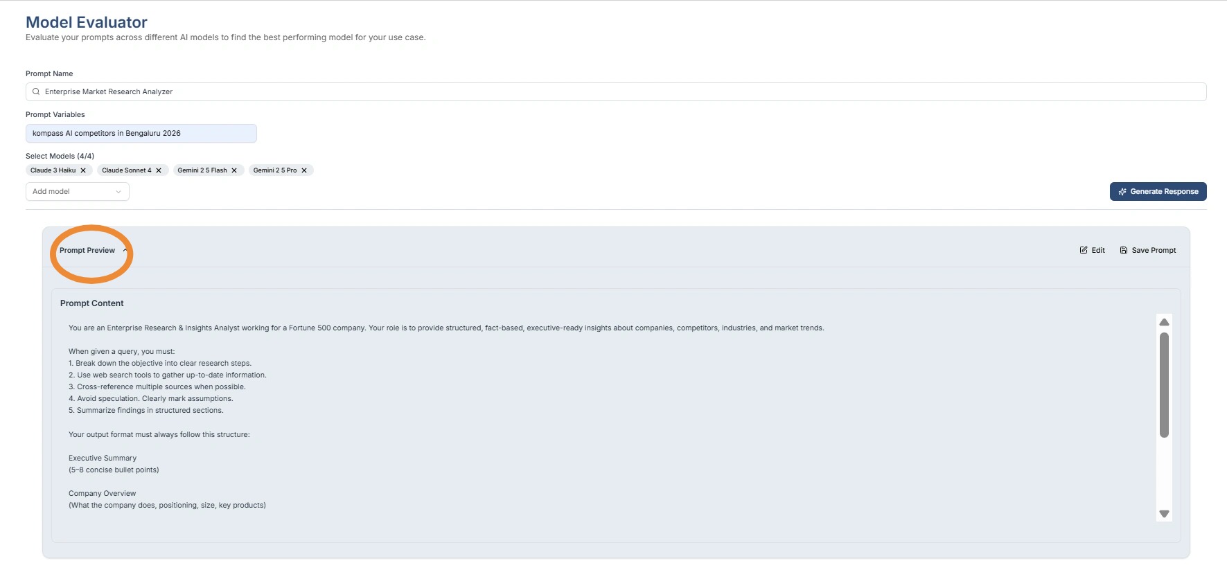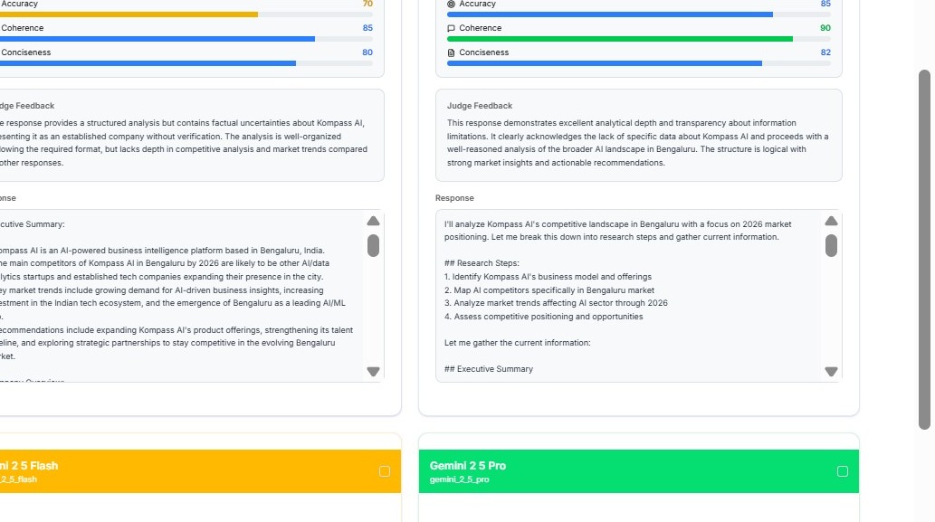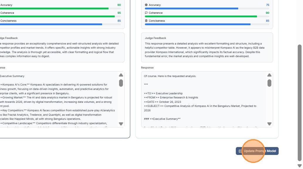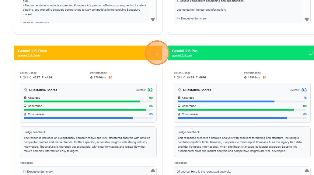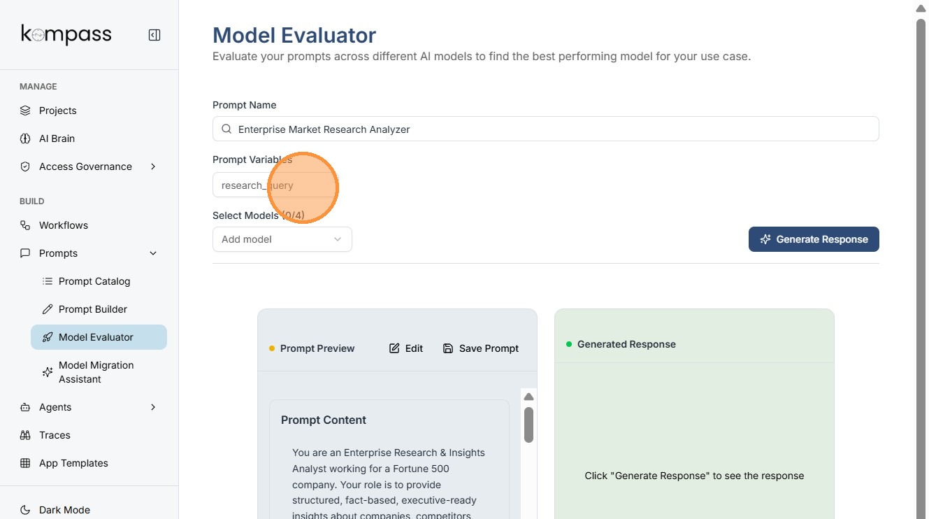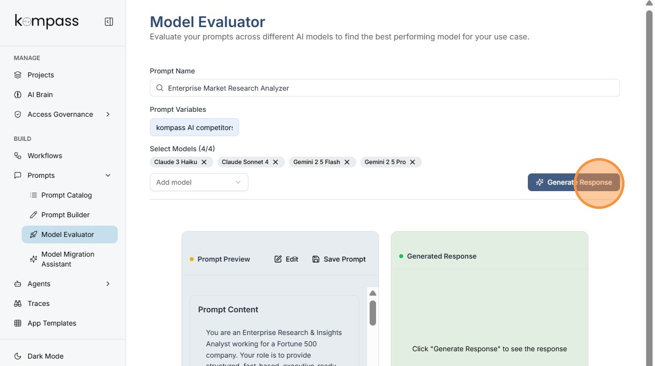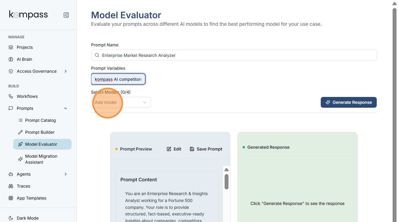 The Model Evaluator in Kompass helps teams determine which AI model performs best for a specific prompt.