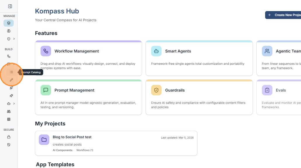 The Prompt Catalog provides a centralized interface for managing AI prompts in Kompass.