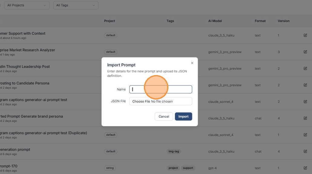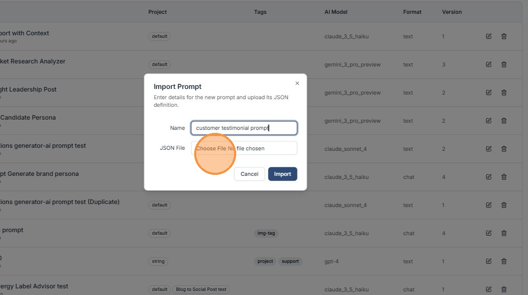 Note: Imported prompt files must be in JSON format only (.json extension) — other formats like TXT or YAML are not supported.