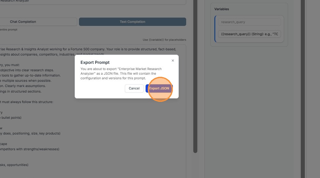 The Export JSON option allows users to download a prompt configuration.