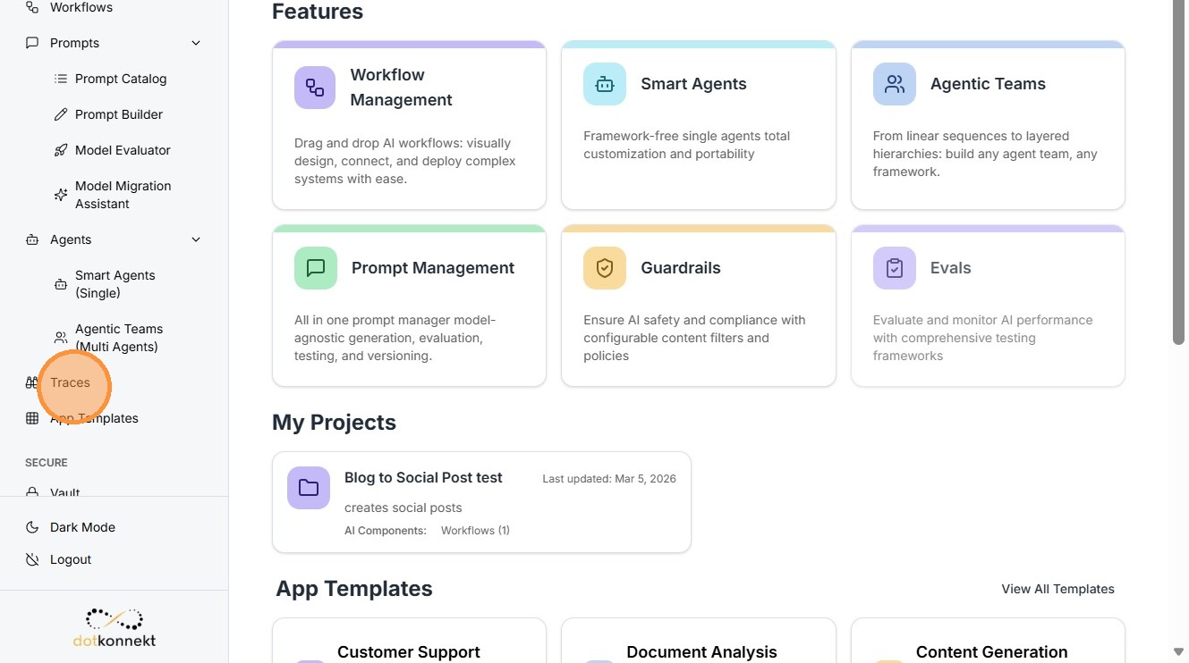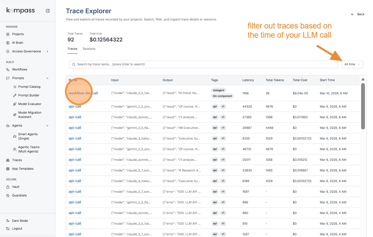 The Traces component in Kompass provides complete visibility into how AI agents, workflows, prompts, and LLM calls execute inside the platform.
