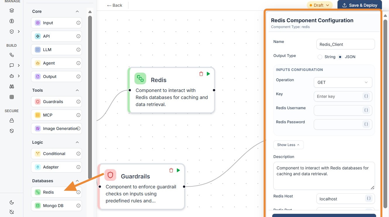 Add Node: Locate Redis under the Databases section in the Component Library and drag it onto the canvas.