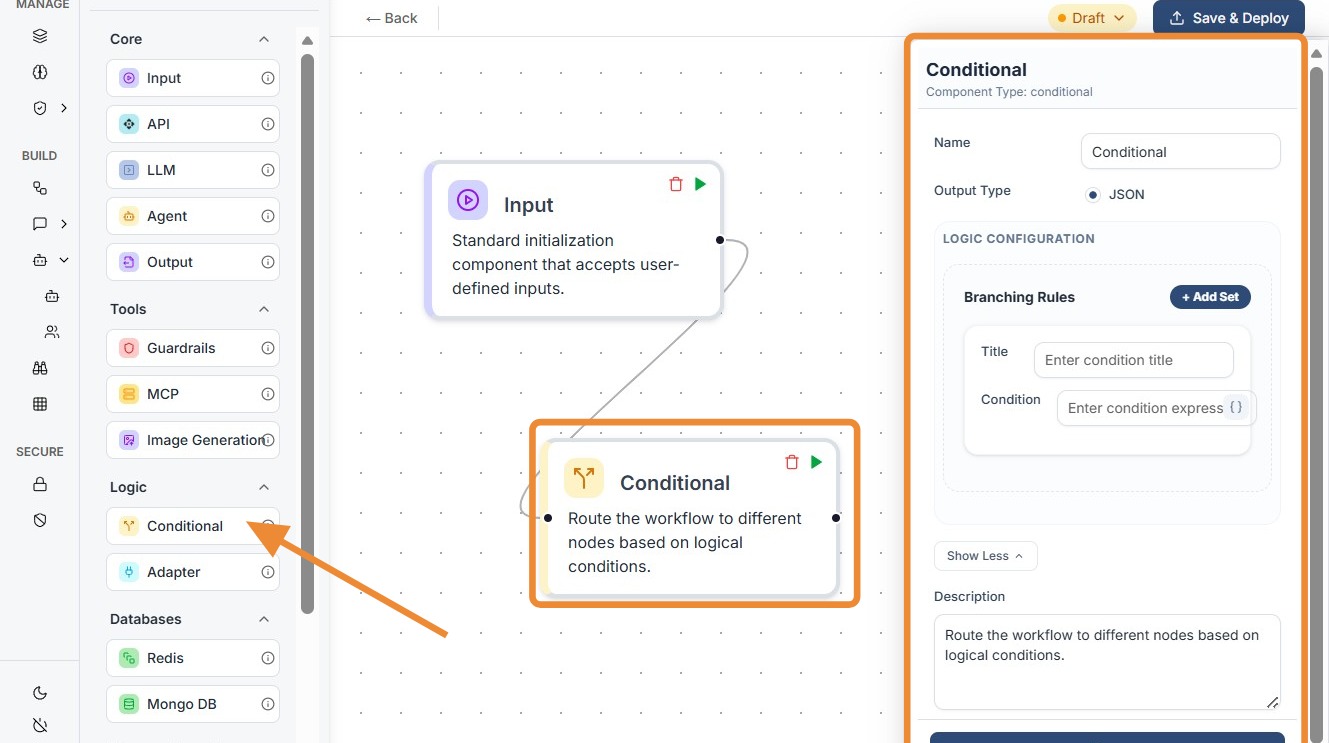 The Conditional Component acts as the primary decision-making hub of your workflow. It allows the system to branch into different paths based on specific logic or data values. By evaluating expressions in real-time, it ensures that only the relevant subsequent nodes are executed, enabling the creation of complex, non-linear AI applications.