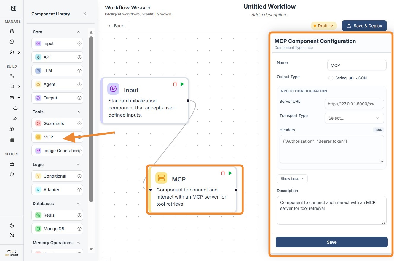 MCPcomponent from the Databases/Integrations section onto the canvas. -