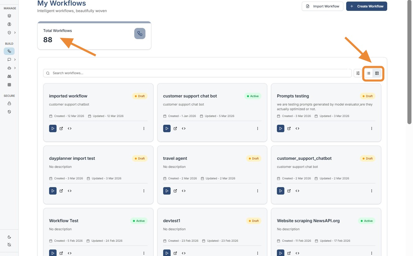 List and Grid Toggle: You can switch between a visual Grid View (ideal for seeing card-based summaries) and a compact List View (optimized for managing high volumes of workflows).
