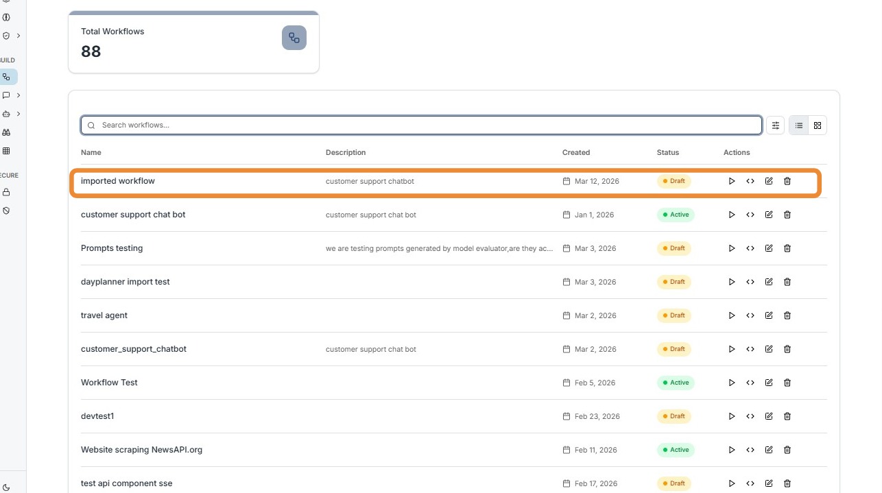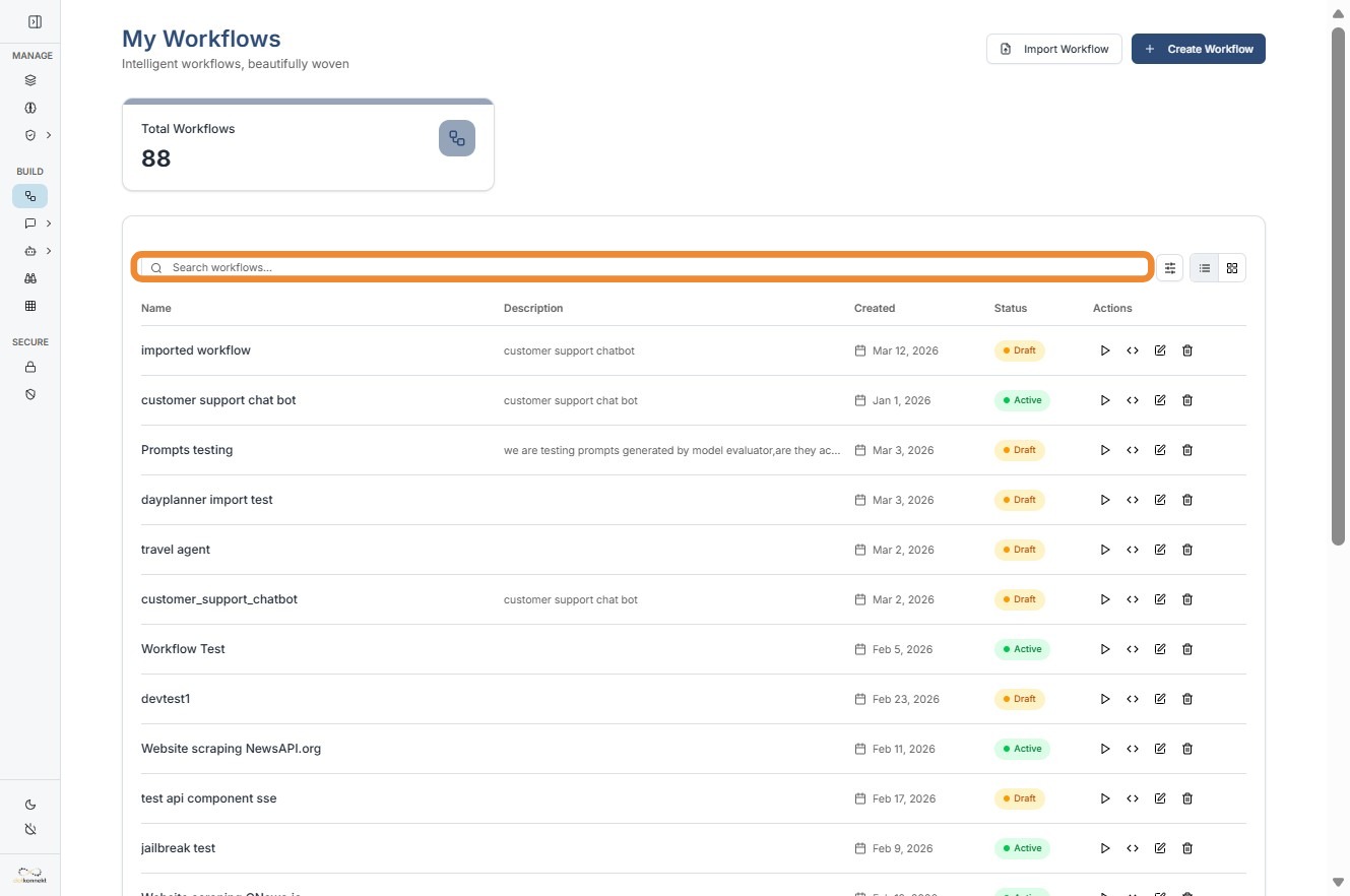 - Global Search Bar: Use the "Search workflows..." field at the top of the dashboard to filter your list by workflow name or specific keywords in real-time.