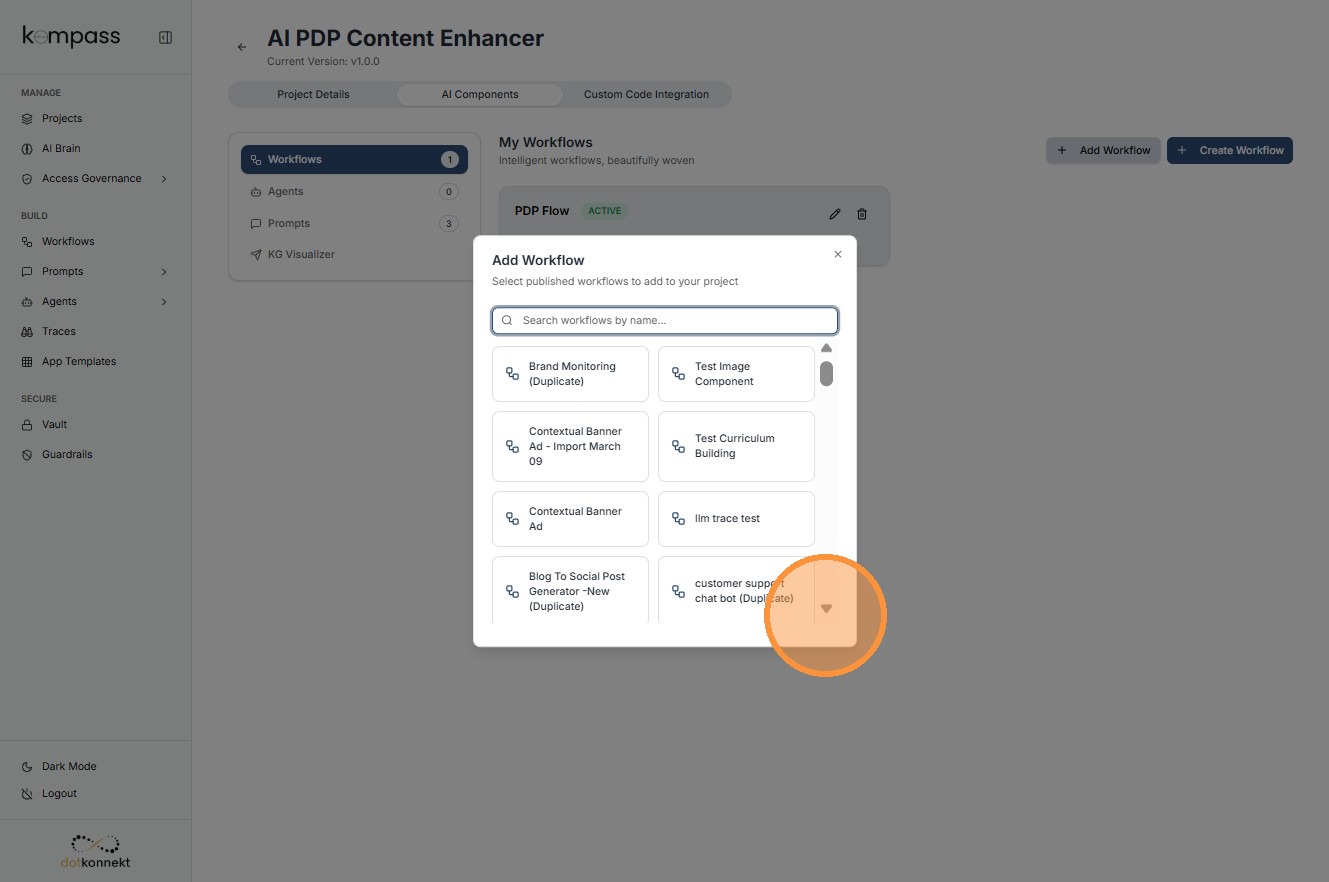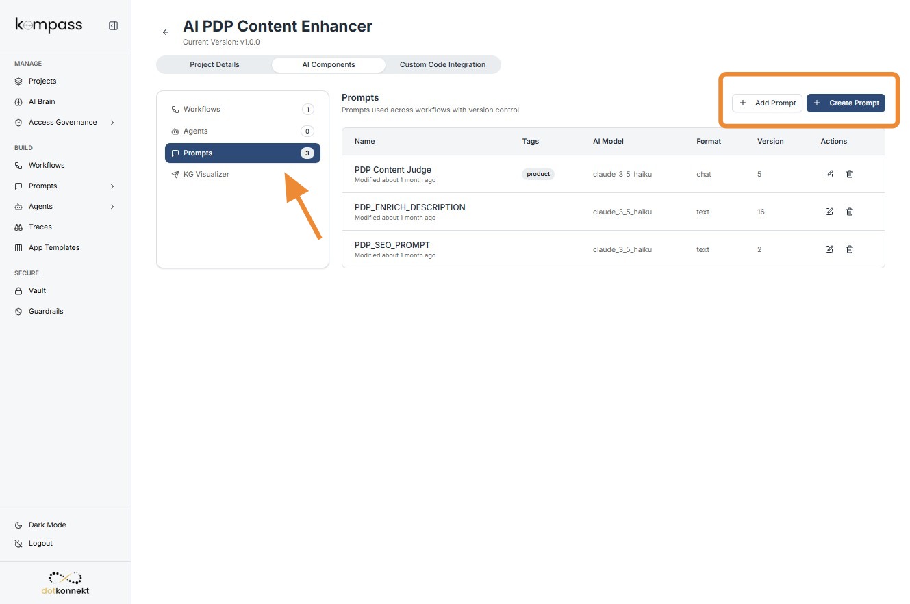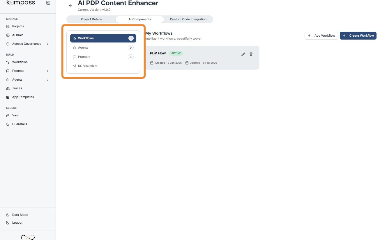 The AI Components section is where all the core building blocks of an AI project are managed.