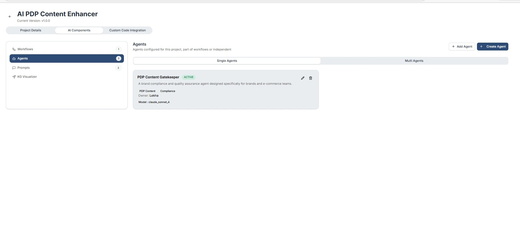 The Agents page shows all AI agents configured within the project.