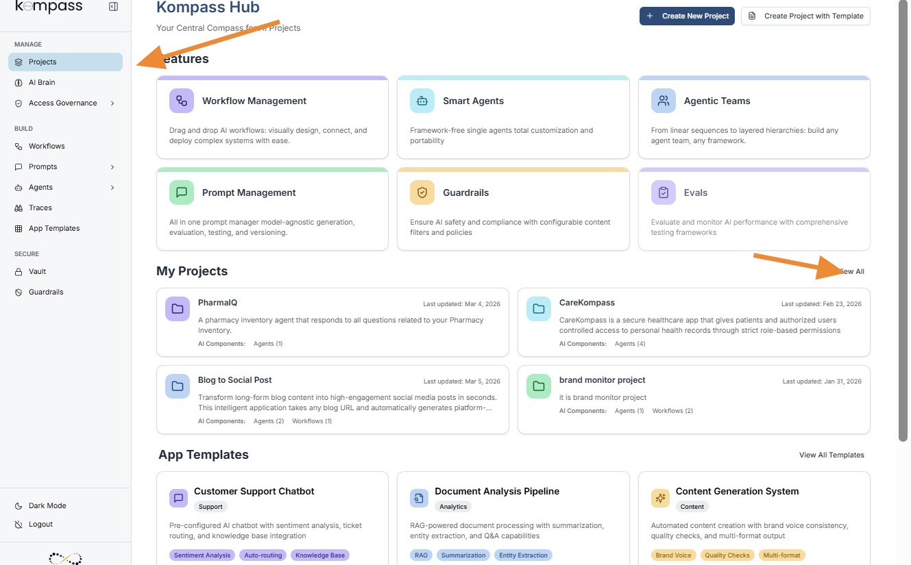The Projects section in Kompass acts as the central hub for managing all AI initiatives within an organization.